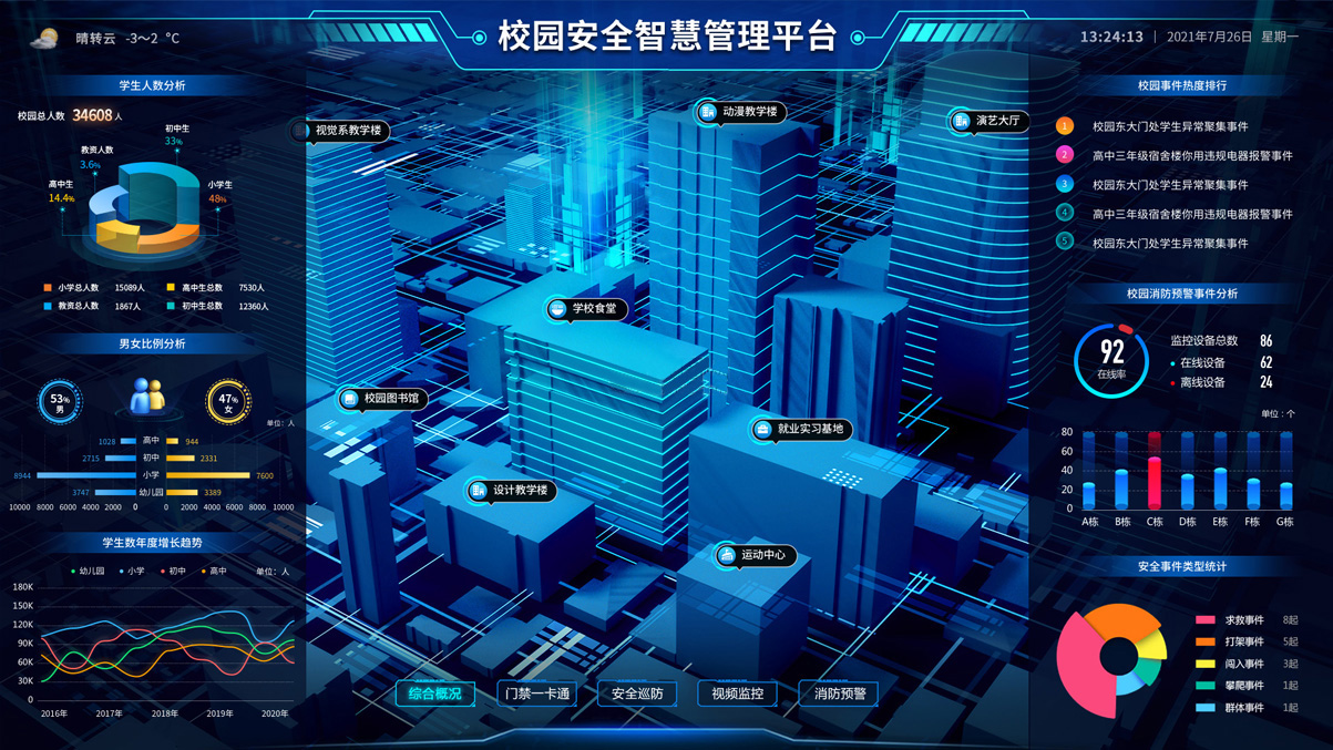 全方位立體式還原院區實貌,分圖層對院區的區域、建筑、單位、安防設備、管理設備、警情等進行查看、監控和跟蹤;通過院區各類安防管理設備實時獲取各重點監控區域的監控數據,對各種突發事件進行報警。通過人臉識別、車牌識別、行為識別、武器管理、營區設備等各類傳感器,對人、車、物及其行為的全面感知,保障營區安全。